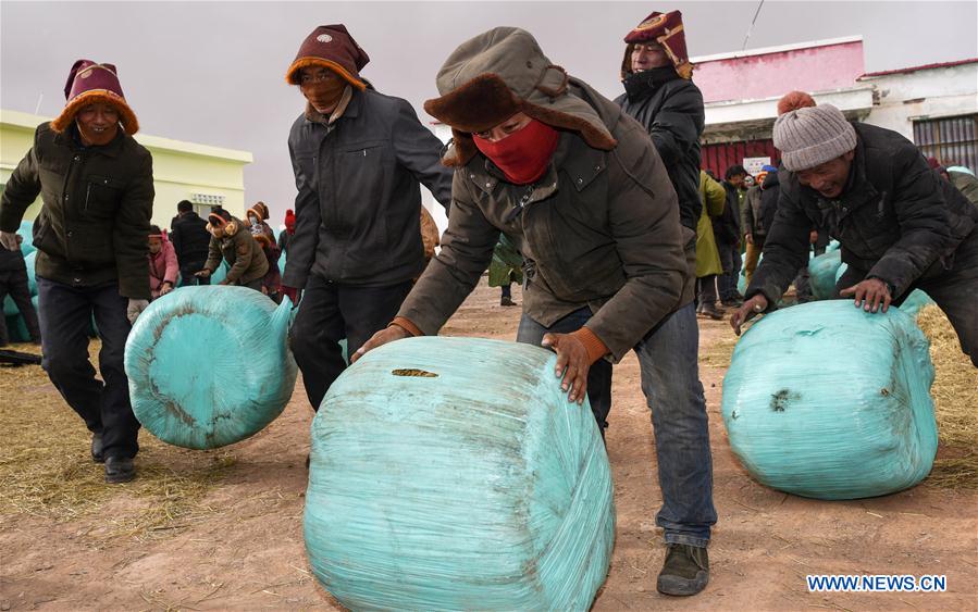Local herdsmen roll packaged fodders in Zhiduo Village, Zhaduo Township of Yushu Tibetan Autonomous Prefecture in northwest China's Qinghai Province, Feb. 23, 2019. Around 80 tonnes of donated fodders arrived at the blizzard-ravaged village Friday night and were distributed to local herdsmen in time to prevent livestock from starving. Yushu has been hit by a number of blizzards since December last year. (Xinhua/Wu Gang)