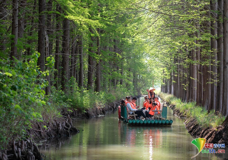 Beijing, April 21 (Youth.cn) - Photo taken in Jinhu water forest scenic area in Huai’an City, Jiangsu Province on April 20th. In this spring time, people went there to enjoy nature and admire lush and green forest landscape. Photo/CFP