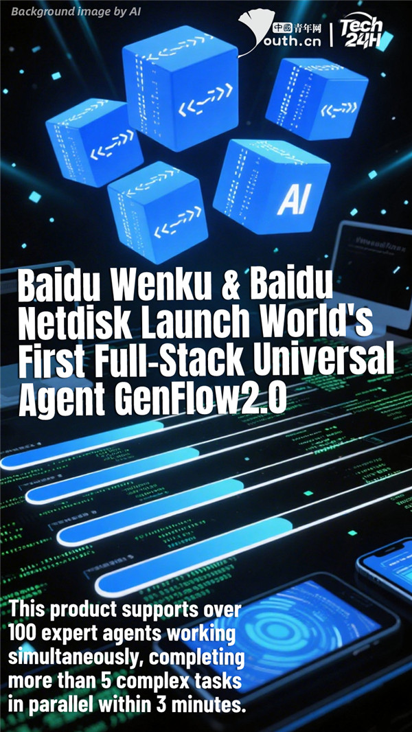 【Tech 24H】On August 18th, Baidu Wenku and Baidu Netdisk jointly launched the world's first full-stack universal intelligent agent "GenFlow2.0." This product supports over 100 expert agents working simultaneously, completing more than 5 complex tasks in parallel within 3 minutes. GenFlow2.0 is now officially available on the Baidu Wenku web and app platforms, accessible to all users immediately with no queue or invitation codes required.