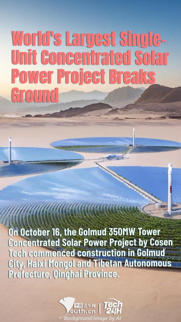 【#Tech24H】On October 16, the Golmud 350MW Tower Concentrated Solar Power Project by Cosen Tech commenced construction in Golmud City, Haixi Mongol and Tibetan Autonomous Prefecture, Qinghai Province. This marks the official start of the world's largest single-unit tower CSP project, featuring the largest mirror field reflection area, the largest energy storage capacity, and the highest annual designed power generation. Upon completion, the project is expected to generate approximately 960 million kilowatt-hours of clean electricity annually, equivalent to saving 263,400 tons of standard coal and reducing carbon dioxide emissions by 720,000 tons.