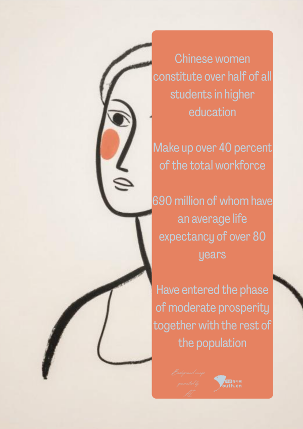 Over the past 30 years, China has contributed uniquely to the global advancement of women through its own practices . On September 19, 2025, The State Council Information Office released the white paper titled The Practice and Achievements of Advancing Women's All-Round Development in the New Era China. Data shows that 690 million Chinese women have entered the phase of moderate prosperity together with the rest of the population. In 2024, women constituted over half of all students in higher education and made up over 40 percent of the total workforce. The average life expectancy for women has surpassed 80 years . In China, women hold up half the sky: