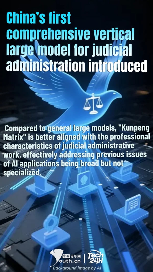 【#Tech24H】China’s first comprehensive vertical large model for judicial administration, "Kunpeng Matrix," was recently officially released. Developed by the Zhanjiang Municipal Justice Bureau, the "Kunpeng Matrix" large-model is grounded in the practical needs of judicial administration and establishes an intelligent work system covering underlying computing support, data resource integration, large model capability development, and upper-level smart application integration. Compared to general large models, "Kunpeng Matrix" is better aligned with the professional characteristics of judicial administrative work, effectively addressing previous issues of AI applications being broad but not specialized. Based on "Kunpeng Matrix," the Zhanjiang Municipal Justice Bureau has successfully developed and applied over 80 intelligent agents, covering core scenarios such as legal aid, legislation and legal awareness, and law-based city governance.