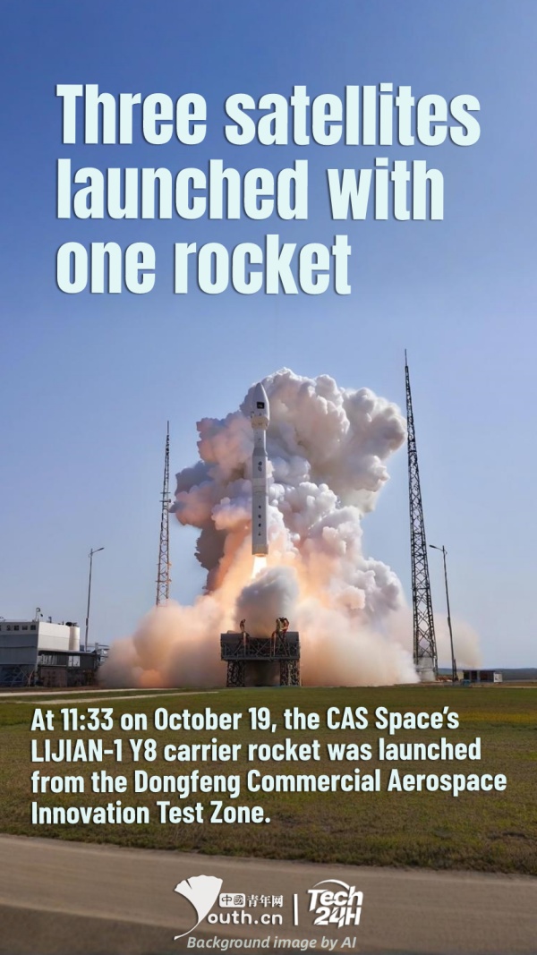 【#Tech24H】At 11:33 on October 19, the CAS Space’s LIJIAN-1 Y8 carrier rocket was launched from the Dongfeng Commercial Aerospace Innovation Test Zone, successfully delivering three satellites—Pakistan Remote Sensing Satellite 02, Zhongke Satellite 03, and Zhongke Satellite 04—into their planned orbits. The flight test mission was a complete success.