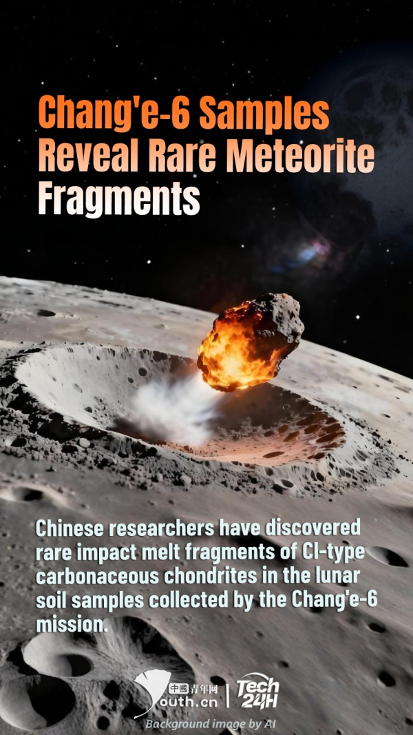 【#Tech24H】Chinese researchers have discovered rare impact melt fragments of CI-type carbonaceous chondrites in the lunar soil samples collected by the Chang'e-6 mission. These fragments are the products formed when the parent body of such meteorites impacted the lunar surface, melted, and rapidly cooled. Meteorites are hailed as "messengers of the solar system," carrying secrets of planetary birth and evolution. This discovery not only confirms that asteroid fragments can travel a "long journey" from the outer solar system to the inner solar system but also provides new clues to explain the origin of water on the Moon.