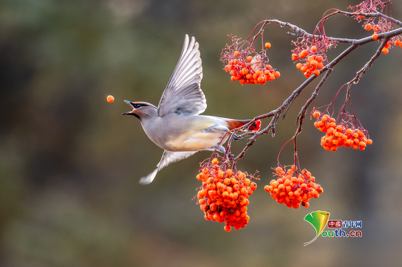 Beijing, November 10 (Youth.cn) - On October 7, 2025, Binzhou Lake, Daqing City, Heilongjiang Province. The Bohemian Waxwings gather to rest and refuel during their southern migration, preparing to continue their journey south. Photo/CFP