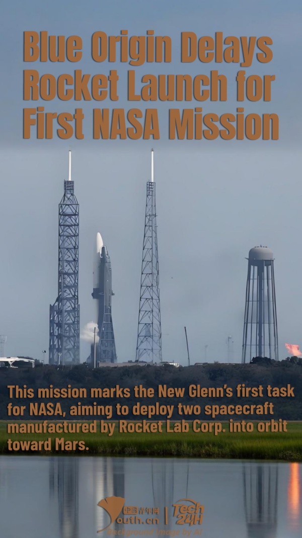 【#Tech24H】Jeff Bezos’ Blue Origin postponed the second planned flight of its flagship New Glenn rocket on Sunday. The rocket, originally scheduled to launch from Cape Canaveral, Florida, faced multiple delays before the mission was canceled due to "weather conditions and unspecified ground equipment issues." This mission marks the New Glenn’s first task for NASA, aiming to deploy two spacecraft manufactured by Rocket Lab Corp. into orbit toward Mars.