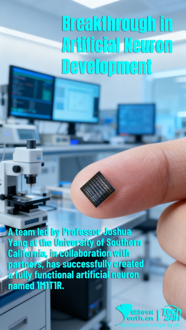【#Tech24H】A team led by Professor Joshua Yang at the University of Southern California, in collaboration with partners, has successfully created a fully functional artificial neuron named 1M1T1R. This artificial neuron operates similarly to real brain cells and holds the potential to enable hardware-based learning systems resembling the human brain, potentially advancing AI toward a form closer to natural intelligence.