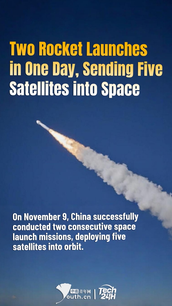 【#Tech24H】On November 9, China successfully conducted two consecutive space launch missions, deploying five satellites into orbit. At 5:01 AM, the Taiyuan Satellite Launch Center used a Long March 11 carrier rocket off the coast of Haiyang, Shandong, to launch the Test-32 satellites (01, 02, and 03) into their planned orbits. At 11:32 AM, the Zhongke Aerospace Li Jian-1 Y9 carrier rocket was launched from the Dongfeng Commercial Space Innovation Test Zone, accurately deploying the Chutian-2 technology test satellites (01 and 02) into orbit via a "single rocket, dual satellite" configuration, marking a complete success for the mission.