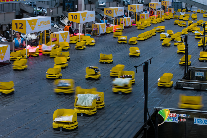 Beijing, November 12 (Youth.cn) - On November 10, 2025, in Deqing County, Huzhou City, Zhejiang Province, the logistics center is ushering in its busiest time of the year. Eight hundred and eighty orange-yellow robot sorters, carrying packages of various clothing items, deftly shuttle across the two-level sorting platform. The sorted goods are then placed into corresponding logistics bags, ready to be dispatched to destinations across the country. Photo/CFP
