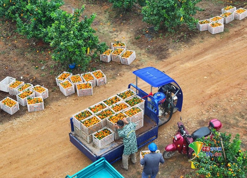 Beijing, November 12 (Youth.cn) - On November 9, 2025, at the sugar orange plantation in Tangzhou Village, Tangzhou Town, Taihe County, Ji'an City, Jiangxi Province, farmers are busy harvesting the ripe fruits. The sugar orange harvest in Taihe County has yielded a bumper crop, with farmers working diligently to pick the fruits at the optimal time to ensure timely distribution to the market. This successful harvest has led to increased income for the local growers. Photo/CFP