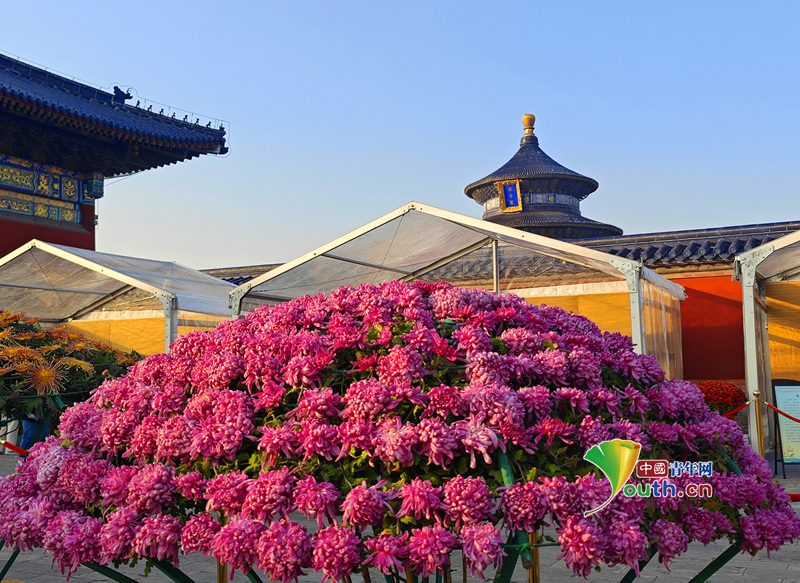 Beijing, November 12 (Youth.cn) - On November 11, 2025, at Beijing's Temple of Heaven Park, the 44th Chrysanthemum Exhibition was in full swing, with a wide variety of chrysanthemums still blooming in all their glory. The flowers, vying for attention in their vibrant splendor, created a breathtaking scene as they harmonized with the ancient altar walls, drawing visitors from around the world to pause and admire the view. Photo/CFP