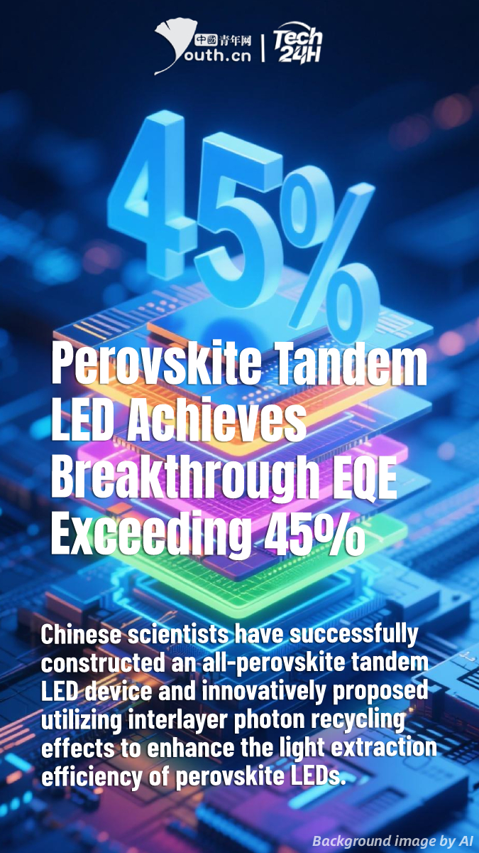 【#Tech24H】Chinese scientists have successfully constructed an all-perovskite tandem LED device and innovatively proposed utilizing interlayer photon recycling effects to enhance the light extraction efficiency of perovskite LEDs. This breakthrough has pushed the external quantum efficiency(EQE) of perovskite tandem LEDs beyond 45%, setting a new world record in the field and paving a novel pathway for developing high-performance perovskite LEDs.