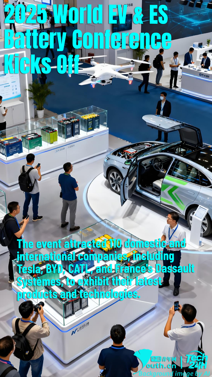 【#Tech24H】The 2025 World EV & ES Battery Conference opened on November 12 in Yibin City, Sichuan Province. The event attracted 110 domestic and international companies, including Tesla, BYD, CATL, and France's Dassault Systèmes, to exhibit their latest products and technologies. A total of 180 projects were signed during the conference, with a combined contract value of 861.3 billion yuan, covering key areas such as power batteries, novel energy storage, photovoltaics, and the digital economy within the green energy sector.
