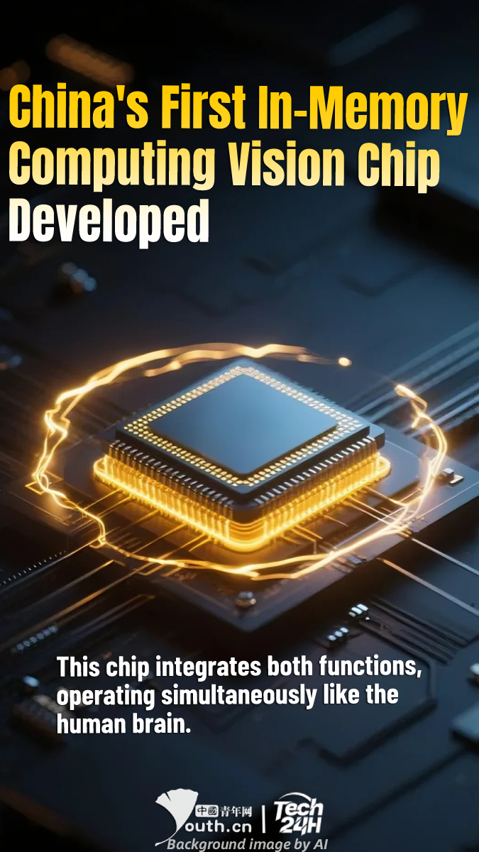 【#Tech24H】The Peking University Wuhan Institute for Artificial Intelligence has successfully developed China's first in-memory computing vision chip, transitioning it from the laboratory to practical application. Unlike current computers and smartphones where data storage and computation are separate, this chip integrates both functions, operating simultaneously like the human brain. Compared to similar international chips, it achieves higher energy efficiency at comparable speeds.