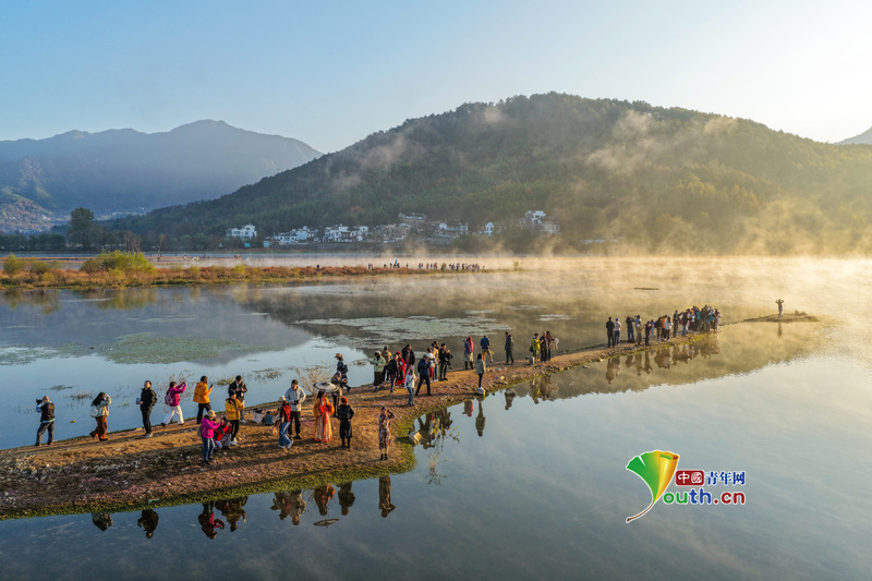 Beijing, November 14 (Youth.cn) - On November 14, 2025, tourists admire the morning mist scenery at Qishu Lake in Huangshan City, Anhui Province.