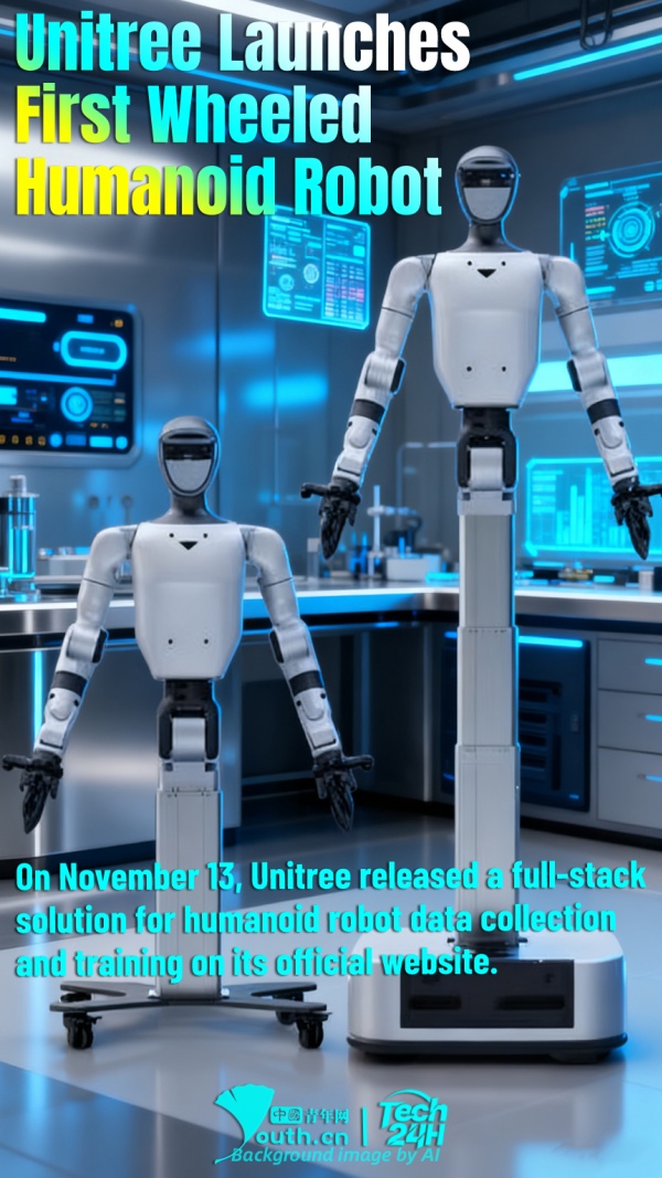 【#Tech24H】On November 13, Unitree released a full-stack solution for humanoid robot data collection and training on its official website. The solution is based on the wheeled robot G1-D, comprising a high-performance humanoid robot body, systematic data collection tools, and comprehensive model training and inference tools. The G1-D adopts a mobile lifting design combining wheels and lifting mechanisms, with a vertical workspace of 0-2 meters and a waist joint motion range of Z-axis ±155° and Y-axis -2.5° to +135°. The G1-D stands between approximately 1260-1680 mm tall, equipped with high-definition binocular cameras on its head and high-definition cameras on its hands.