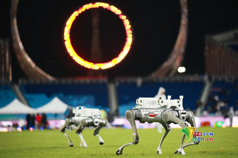 Beijing, November 19 (Youth.cn) - On November 18, 2025, the men’s hammer throw final at China’s 15th National Games was held at the Guangdong Olympic Sports Center Stadium, with robot dogs assisting in the delivery of competition equipment. Photo/CFP