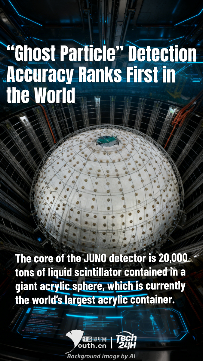 【#Tech24H】On November 19, the Institute of High Energy Physics of the Chinese Academy of Sciences announced that China’s major scientific projec, the Jiangmen Underground Neutrino Observatory (JUNO), delivered impressive results just two months after operation: measuring solar neutrino oscillation parameters with an accuracy 1.5 to 1.8 times higher than the best previous experiments. The core of the JUNO detector is 20,000 tons of liquid scintillator contained in a giant acrylic sphere, which is currently the world’s largest acrylic container. This increases the volume of the liquid scintillator by 20 times compared to the largest international scale. This makes the detector like a highly sensitive “big eye”, capable of accurately capturing and detecting neutrinos.
