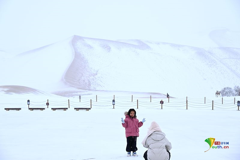 Beijing, November 25 (Youth.cn) - On November 23, 2025, in Jiuquan City, Gansu Province, as the season’s first snowfall blanketed the area, the Mingsha Mountain Crescent Spring was draped in a pristine layer of white, creating a picturesque scene. Photo/CFP