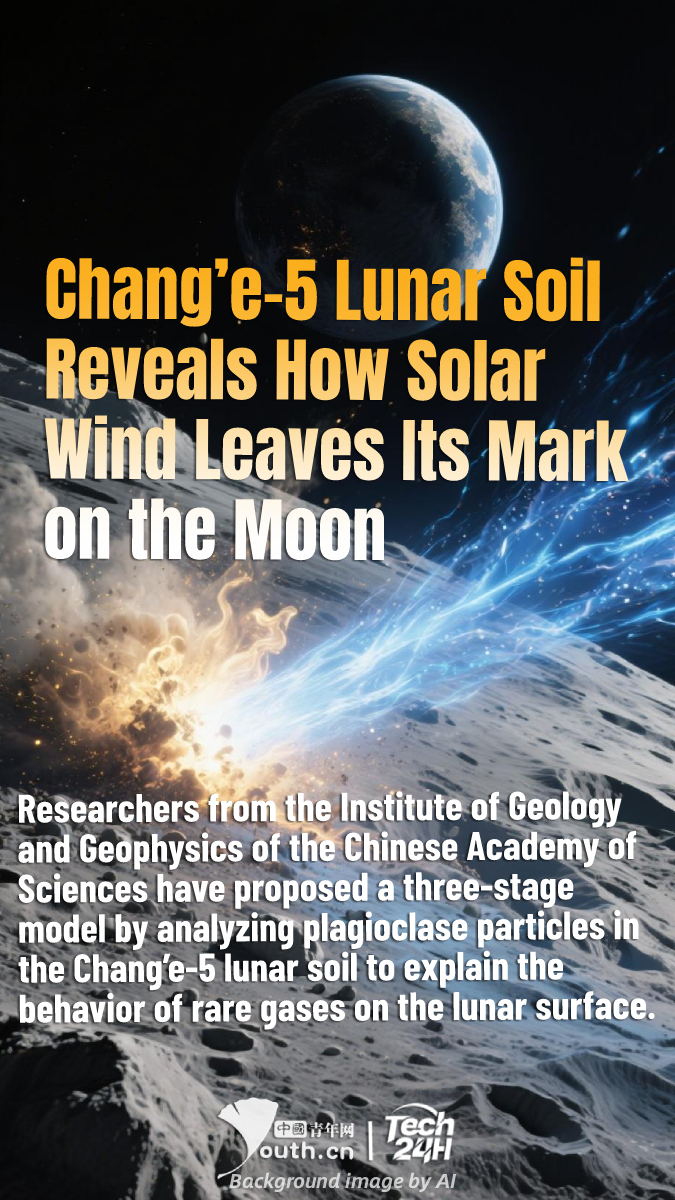 【#Tech24H】Researchers from the Institute of Geology and Geophysics of the Chinese Academy of Sciences have proposed a three-stage model by analyzing plagioclase particles in the Chang’e-5 lunar soil to explain the behavior of rare gases on the lunar surface, including solar wind and cosmic ray injection, local thermal diffusion, and re-irradiation. This model indicates that solar wind injection and gas escape are interrelated processes: some light elements may be instantaneously released due to micro-damage in minerals upon impact, entering the lunar exosphere; micrometeorite impacts and diurnal temperature fluctuations further promote gas diffusion and escape, resulting in significant variations in gas content among different particles. This achievement is the first to unveil the key mechanisms of solar wind interaction with the lunar surface, providing new clues for understanding the distribution of lunar volatiles and solar evolution.