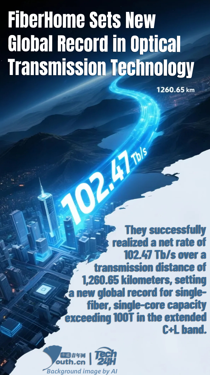【#Tech24H】Recently, FiberHome, in collaboration with Soochow University and the State Key Laboratory of Optical Fiber Communication Technology and Networks, achieved a significant breakthrough in ultra-long-distance optical transmission experiments. They successfully realized a net rate of 102.47 Tb/s over a transmission distance of 1,260.65 kilometers, setting a new global record for single-fiber, single-core capacity exceeding 100T in the extended C+L band. This experiment marks the first time globally that both the “100T capacity” and “1,200-kilometer distance” thresholds have been simultaneously surpassed, providing a solid technological foundation for China’s strategic projects such as “East Data West Computing” and AI computing power networks.