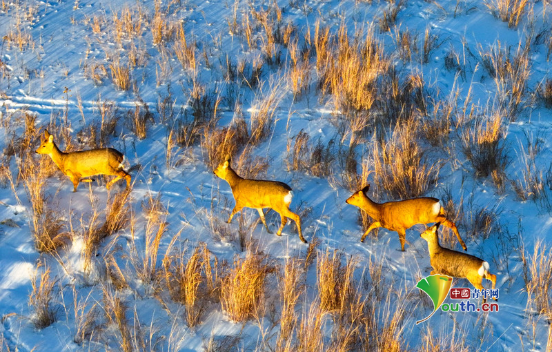 Beijing, December 29 (Youth.cn) - On December 28, 2025, wild roe deer were seen running across the snowfield.