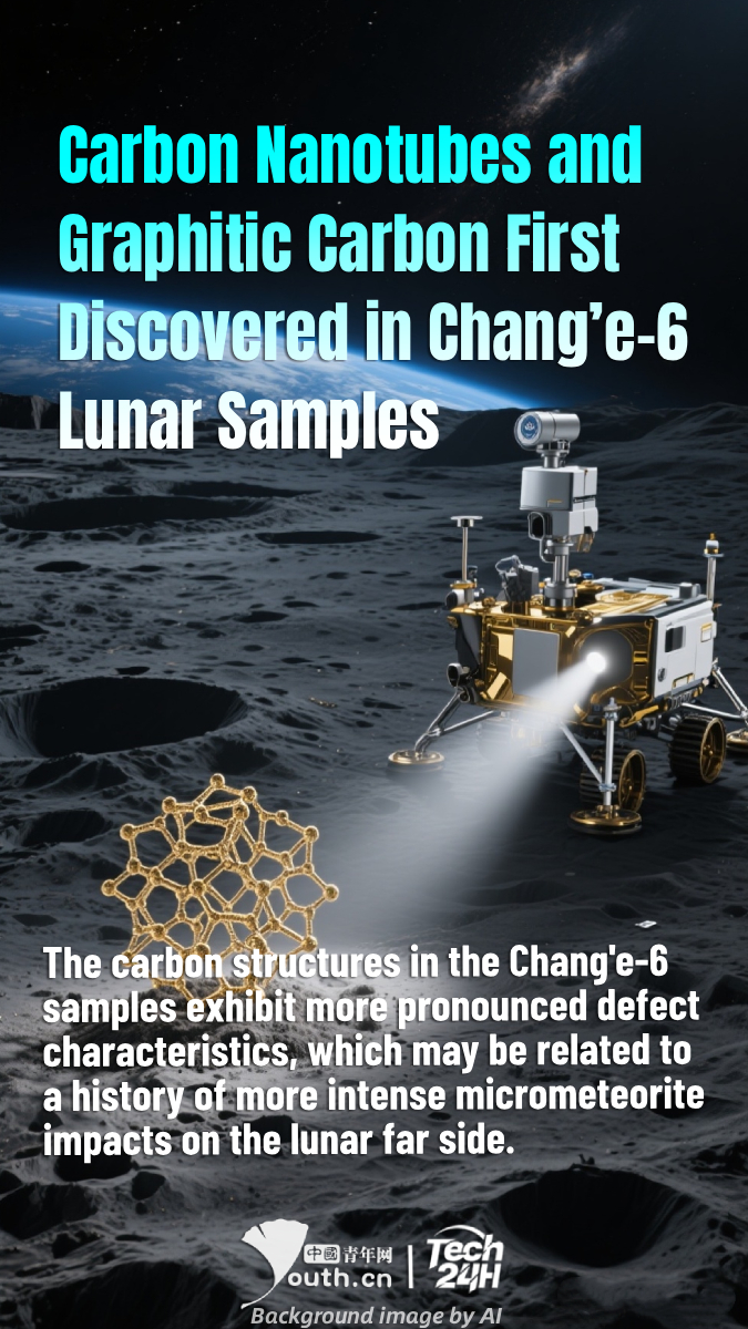 Through systematic analysis of lunar soil samples returned by the Chang’e-6 mission, China has, the first time in the world, discovered and confirmed naturally occurring single-walled carbon nanotubes and graphitic carbon. This finding reveals the intricacy of high-energy physical and chemical processes on the lunar surface, supports the hypothesis of more active geological activity on the far side of the Moon, and provides crucial data for studying the lunar evolution history. Most importantly, it represents the first international confirmation of the natural existence of single-walled carbon nanotubes without artificial intervention. By comparing the far-side samples from Chang’e-6 with the near-side samples from Chang’e-5, the research team also found that the carbon structures in the Chang'e-6 samples exhibit more pronounced defect characteristics, which may be related to a history of more intense micrometeorite impacts on the lunar far side. Additionally, this discovery unveils new asymmetries in material composition and evolutionary processes between the near side and far side of the Moon.