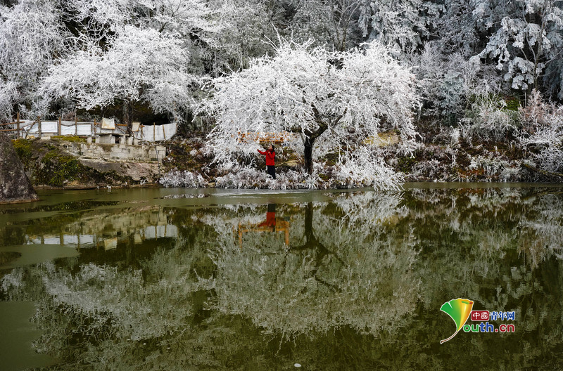 Beijing, January 23 (Youth.cn) - On January 22, 2026, at Yuanbao Mountain in Rongshui Miao Autonomous County, Liuzhou, Guangxi, visitors took photos against a backdrop of frost-covered trees.