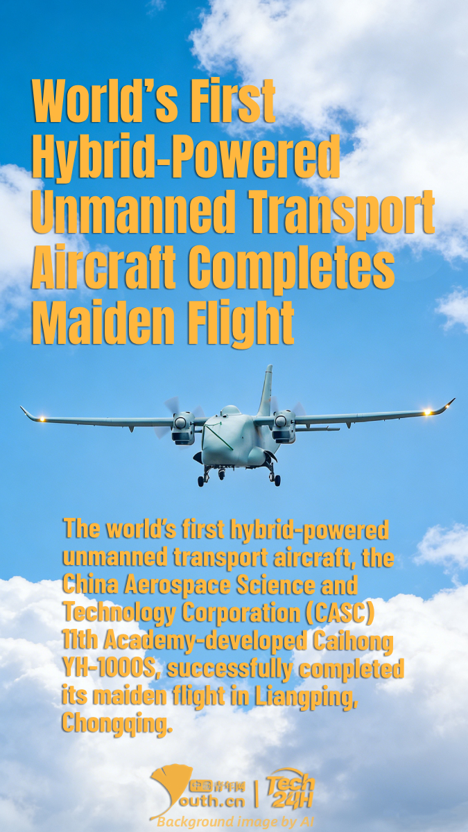 【#Tech24H】The world’s first hybrid-powered unmanned transport aircraft, the China Aerospace Science and Technology Corporation (CASC) 11th Academy-developed Caihong YH-1000S, successfully completed its maiden flight in Liangping, Chongqing, on February 1. Equipped with a high-power hybrid powertrain, the drone significantly reduces takeoff and landing distances while increasing payload and range. This marks China's first cross-industry integration of core technologies from the drone and automotive sectors. Through deep supply chain resource sharing and modular production, the research, development, and manufacturing costs of the drone have been substantially reduced. The aircraft can play a significant role in international logistics and delivery, emergency rescue and disaster relief, weather modification, ocean monitoring, and maritime supervision.