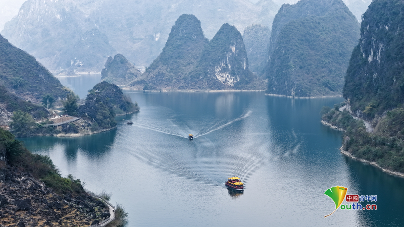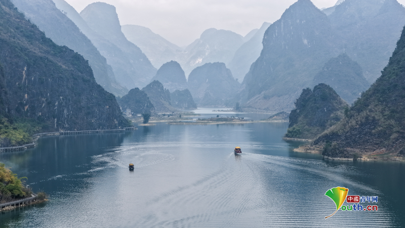 Beijing, February 26 (Youth.cn) - On February 22, 2026, at Haokun Lake in Lingyun County, Baise City, Guangxi Zhuang Autonomous Region, the picturesque landscape of lakes and mountains attracted tourists to enjoy the scenery and relax during the holiday. Photo/CFP