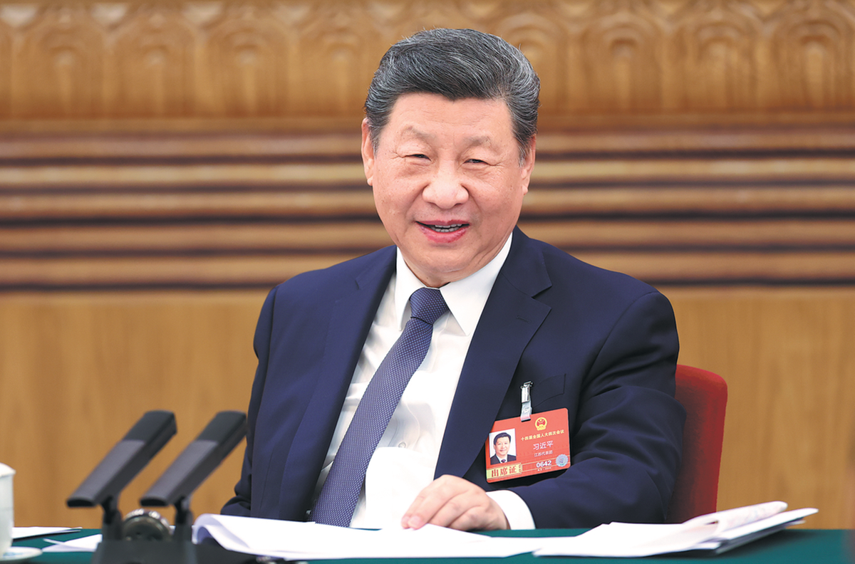 President Xi Jinping, who is also general secretary of the Communist Party of China Central Committee and chairman of the Central Military Commission, takes part in a deliberation in Beijing on Thursday with his fellow deputies from Jiangsu province at the fourth session of the 14th National People's Congress, the national legislature. SHENG JIAPENG/XINHUA