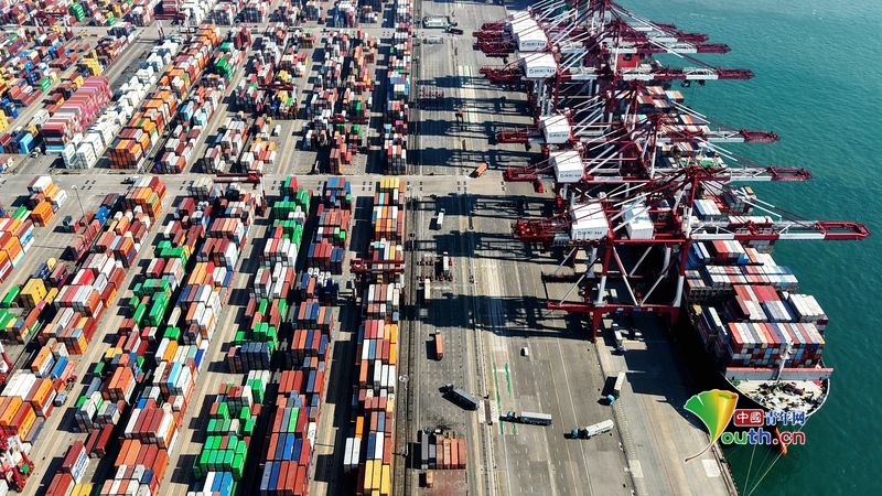 Beijing, March 13 (Youth.cn) - On March 13, 2026, in Qingdao, Shandong Province, gantry cranes at the Qingdao Port stretched their arms to load and unload giant vessels. The entire port buzzed with a spring surge of activity, bustling with trade operations. Photo/CFP