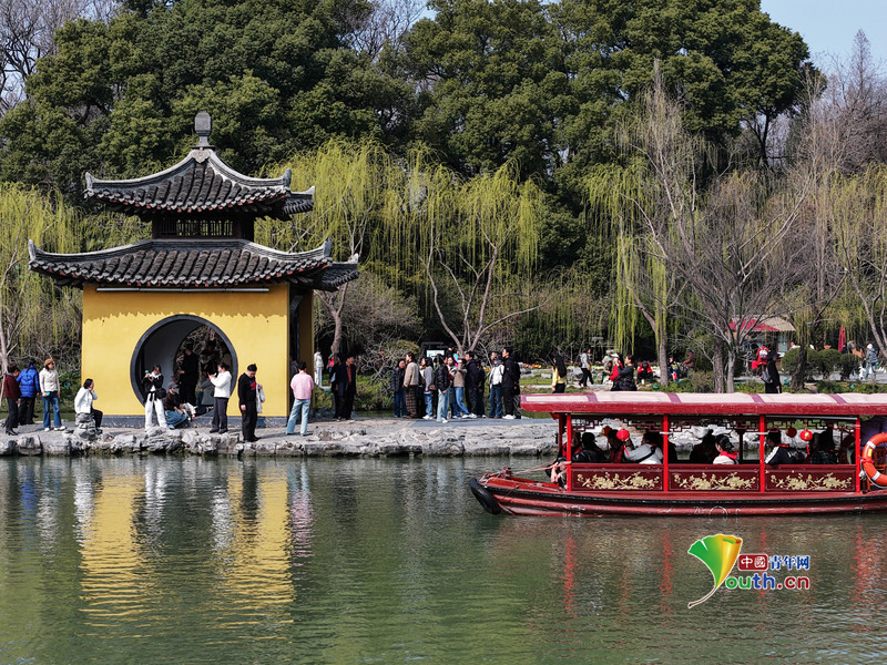 Beijing, March 13 (Youth.cn) - On March 12, 2026, in Yangzhou, Jiangsu Province, spring flowers were in bloom at the Slender West Lake Scenic Area, presenting a picturesque and charming view. People stepped out of their homes to enjoy the beautiful outdoor spring scenery. Photo/CFP