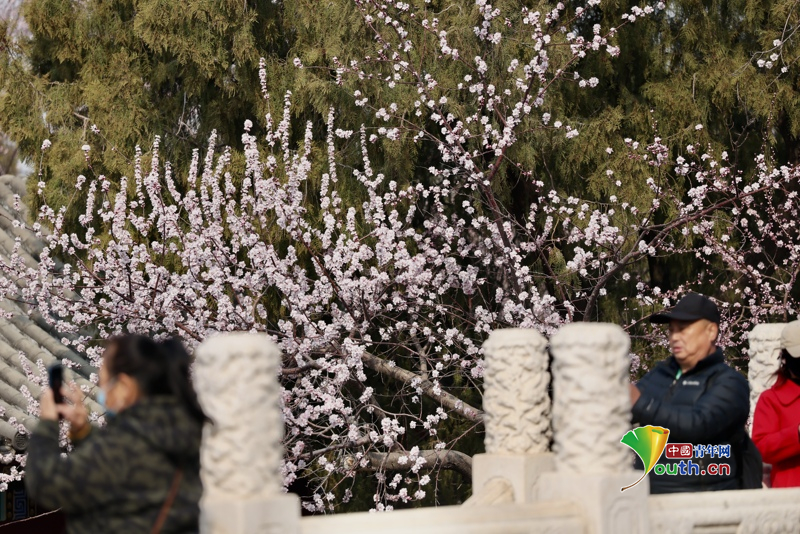 Beijing, March 13 (Youth.cn) - As the spring breeze sweeps through the capital, the mountain peach blossoms on Qionghua Island in Beihai Park have reached their peak bloom. Clusters of pink and white flowers adorn the branches, creating a delightful contrast with the ancient White Pagoda and architecture. This attracts numerous citizens and tourists who come for a spring outing, sightseeing, and taking photos. Photo/CFP