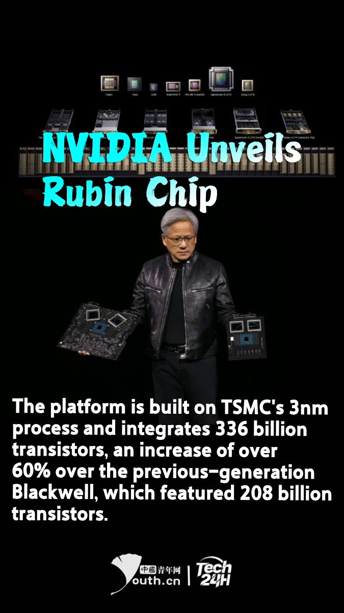 【#Tech24H】On March 16, NVIDIA founder Jensen Huang officially unveiled the Vera Rubin AI acceleration platform at the GTC 2026 conference. The platform is built on TSMC's 3nm process and integrates 336 billion transistors, an increase of over 60% over the previous-generation Blackwell, which featured 208 billion transistors. Rubin is not a single chip, but a six-chip collaborative platform carefully designed by NVIDIA. The Vera Rubin superchip packages one Vera CPU and two Rubin GPUs into a single processor. The remaining four chips—the NVLink 6 switch, ConnectX-9 super NIC, BlueField-4 DPU, and Spectrum-6 Ethernet switch—work together to form the complete AI factory infrastructure. NVIDIA expects the Rubin Ultra to enter mass production and ship in the second half of 2027.