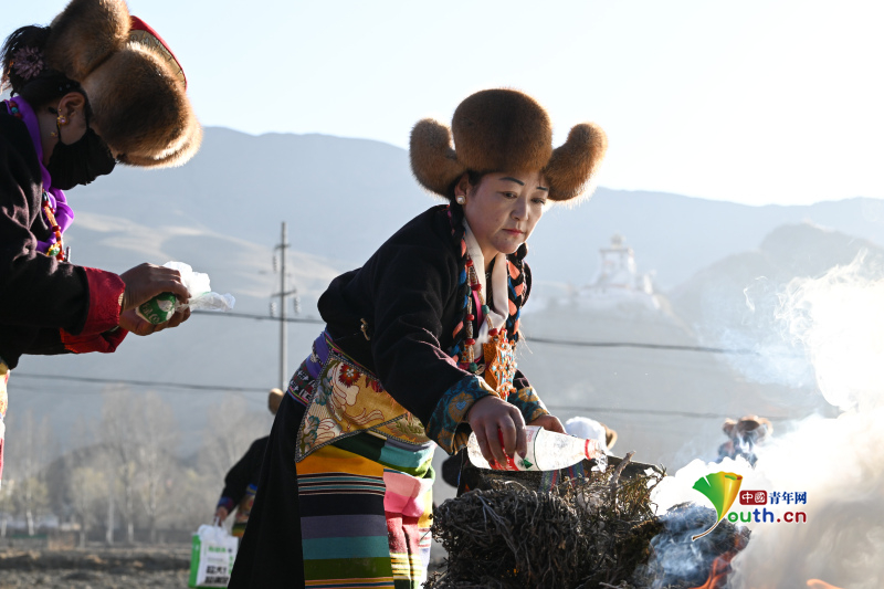 Beijing, March 17 (Youth.cn) - On March 16, 2026, Shannan City, Xizang Autonomous Region. Villagers dressed in traditional attire and held highland barley wine in hand as they sowed the first seeds of spring at the foot of the Yumbulagang Palace. Photo/CFP