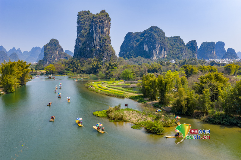 Beijing, March 18 (Youth.cn) - On March 14, 2026, at the Wanjing ferry section of the Yulong River in Yangshuo County, Guilin City, Guangxi Zhuang Autonomous Region, numerous tourists floated on bamboo rafts, enjoying the delightful spring scenery. Photo/CFP