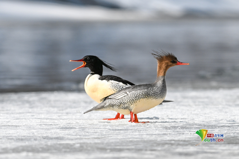 Beijing, March 19 (Youth.cn) - On March 17, 2026, as the snow and ice began to melt in Manjiang Town, Fusong County, Baishan City, Jilin Province, nationally protected first-class species, Scaly-sided Mergansers, were seen swimming gracefully and diving for food in the open water. Photo/CFP