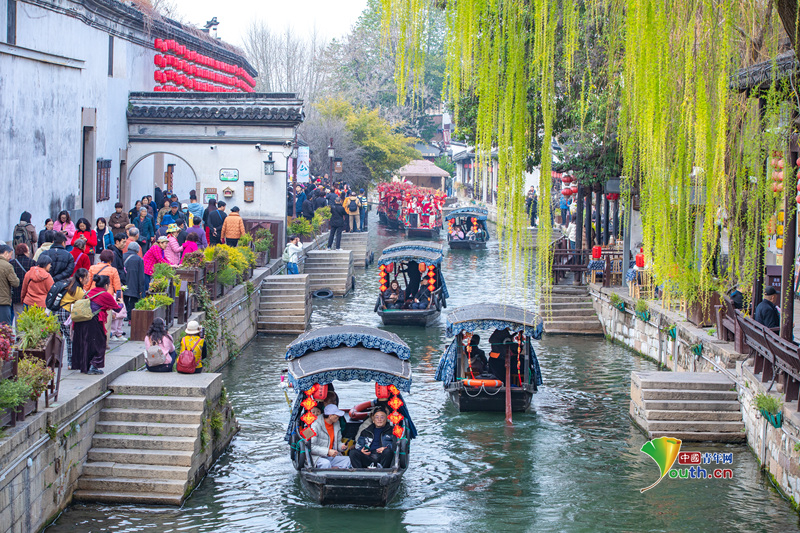 Beijing, March 20 (Youth.cn) - On March 19, 2026, in Huzhou City, Zhejiang Province, Nanxun Ancient Town experienced a peak in spring tourist traffic. Boats shuttled back and forth amidst the crowds of visitors, with weeping willows lining the banks, painting a vivid and bustling picture of spring in Jiangnan (south regions of the Yangtze River). Photo/CFP