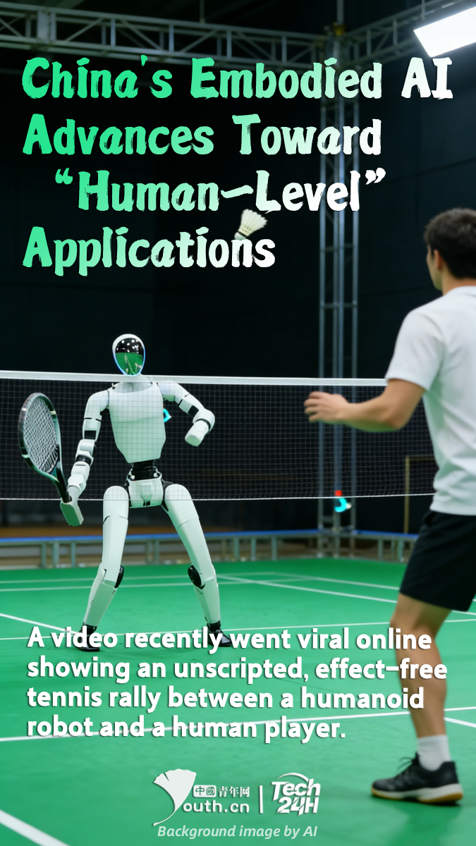 【#Tech24H】A video recently went viral online showing an unscripted, effect-free tennis rally between a humanoid robot and a human player. The robot demonstrated flexible on-court movement, real-time judgment, and smooth swings, engaging in multiple rounds of high-quality rallies. This humanoid robot was developed by Beijing-based Galaxy General Robotics. Its proprietary intelligent planning and control algorithm, “LATENT”, acts as a “motor cerebellum” for the robot. It enables the robot to autonomously learn movement logic from fragmented human motion information, without needing expensive motion capture data. Tests show the robot achieves a forehand shot success rate exceeding 90%, can sustain 20 consecutive rally games, and locks onto incoming balls traveling at 50 km/h within 0.1 seconds, balancing flexibility and stability.