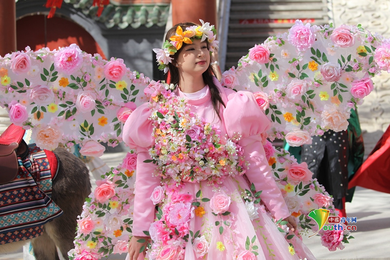 Beijing, March 23 (Youth.cn) - On March 21, 2026, in Hami City, Xinjiang, a spring outing event blending folk customs with adorable pets was held at the Hami King's Palace during the Roza Festival. Dressed in elaborate costumes, "flower fairies" strolled through the ancient garden, enjoying the spring scenery with visitors. Photo/CFP