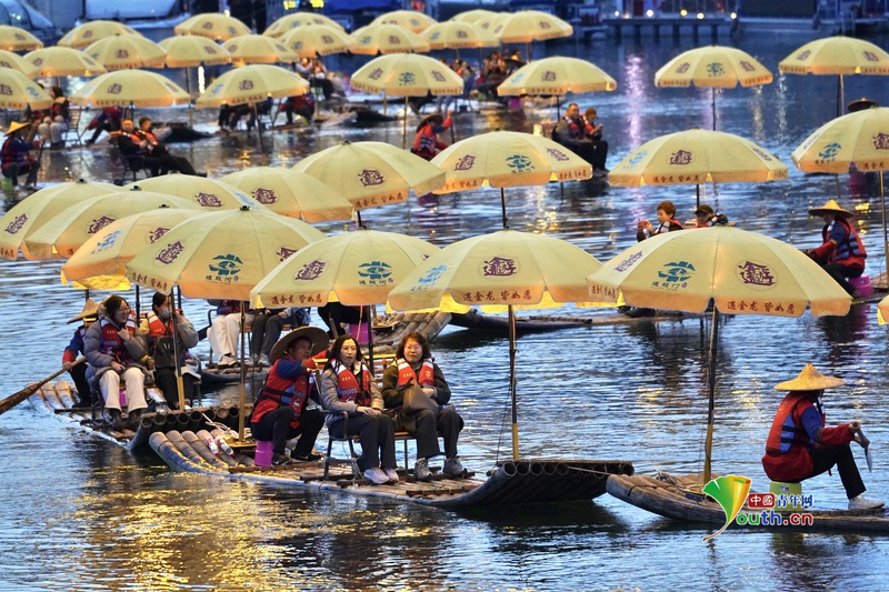 Beijing, March 23 (Youth.cn) - On March 22, 2026, the Yangshuo Golden Dragon Parade in Guangxi made an appearance on Beijing's Liangma River. The golden dragon, formed by 36 bamboo rafts and stretching 241.2 meters in total length, created a spectacle of flowing light and shadow that intermingled with the riverside lanterns, adding a magnificent intangible cultural heritage water scene to the Liangma River. Photo/CFP