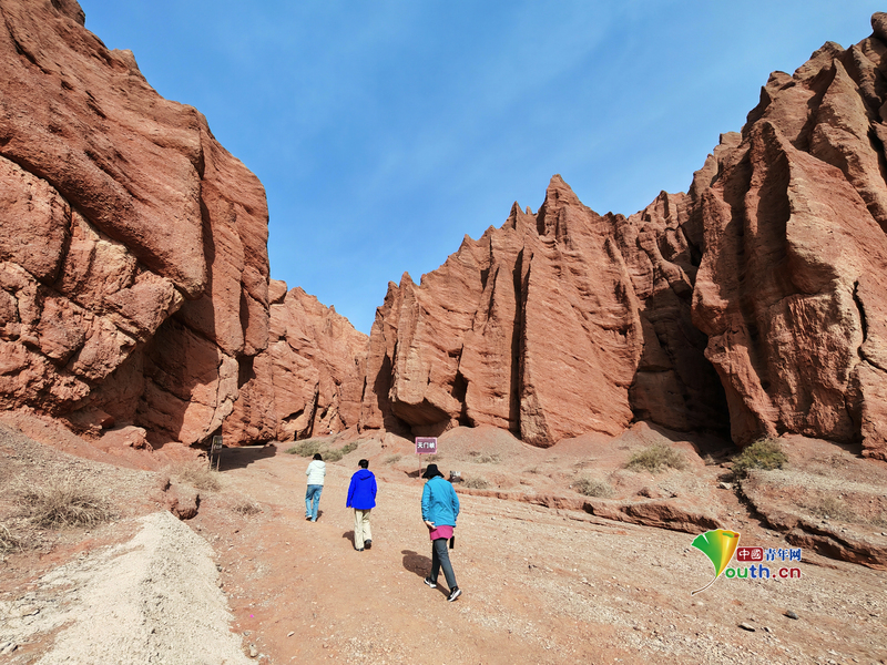 Beijing, March 24 (Youth.cn) - On March 21, 2026, in Turpan City, Xinjiang, the Fire Cloud Valley Scenic Area, is the source of the Flaming Mountains. After eons of weathering, erosion, and water scouring, the area has been shaped into landscapes featuring red cliffs and sandstone peaks. At sunset, the red rock layers display a brilliant gradient of gold and red hues. Photo/CFP