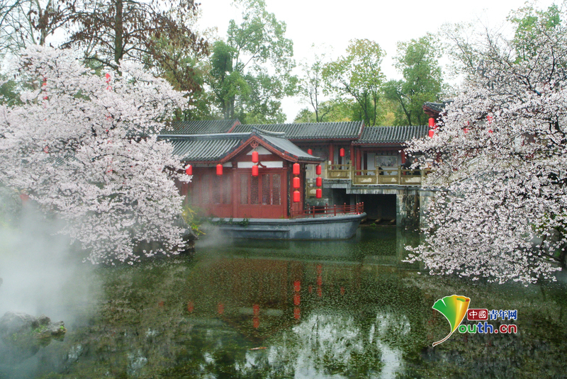 Beijing, March 25 (Youth.cn) - On March 24, 2026, the cherry blossom garden at Wuhan East Lake entered its peak viewing period, attracting visitors to take photos. The diverse array of medium-blooming cherry varieties together create an endless expanse of pink clouds. The uniquely styled Tang-style architecture stands amidst the sea of flowers, with upturned eaves and corners appearing and disappearing among the cherry branches and the swirling mist from timed sprinklers. Photo/CFP