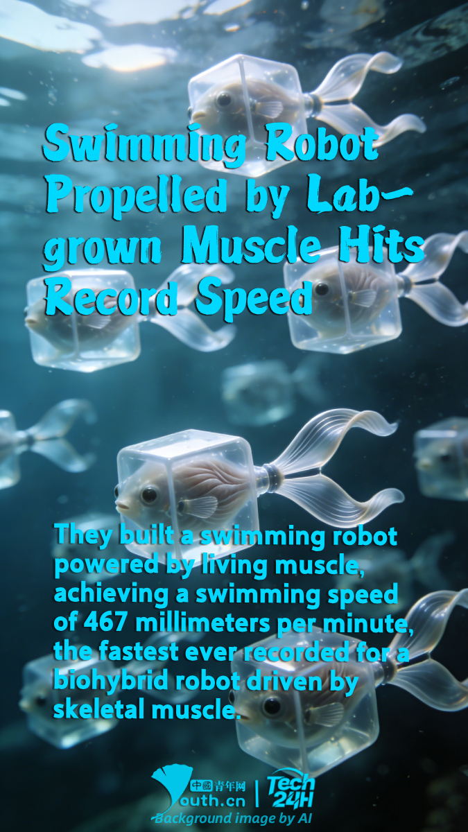 【#Tech24H】A research team from the National University of Singapore has developed a platform that allows lab-grown muscle tissue to undergo self-training without external stimulation. The researchers mechanically coupled two muscle tissues to continuously stretch each other, with their natural contraction process effectively providing round-the-clock exercise. Based on this method, they built a swimming robot powered by living muscle, achieving a swimming speed of 467 millimeters per minute, the fastest ever recorded for a biohybrid robot driven by skeletal muscle.