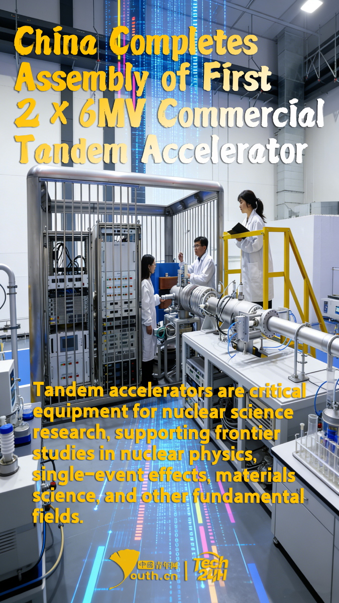 【#Tech24H】China's first 2×6MV commercial tandem accelerator has recently completed assembly and cold testing, with all performance indicators meeting design specifications. The system is now ready for delivery. Tandem accelerators are critical equipment for nuclear science research, supporting frontier studies in nuclear physics, single-event effects, materials science, and other fundamental fields. They also have broad applications in semiconductor high-energy ion implantation and biomedical research.