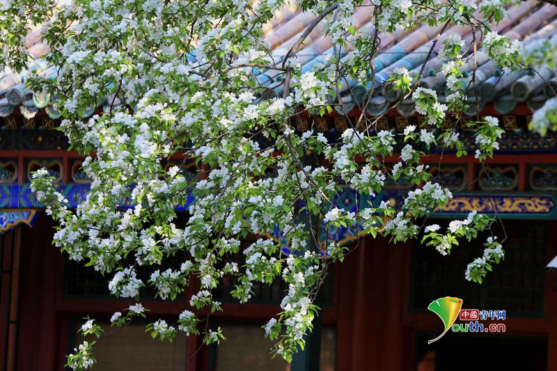 Beijing, April 8 (Youth.cn) - On April 7, 2026, in Beijing, the ancient trees behind Chengguang Hall, located outside the Beihai Park in Tuancheng, saw the “three whites”, white crabapple flowers, white pear blossoms, and white lilacs, reaching their prime. Photo/CFP