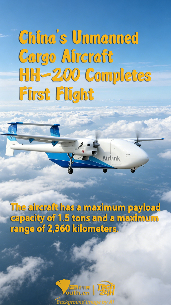 【#Tech24H】China’s domestically developed HH-200 commercial unmanned aerial cargo system has completed its maiden flight test in Pucheng, Shaanxi Province. The HH-200 system consists of an unmanned aircraft and a ground support system. The aircraft has a maximum payload capacity of 1.5 tons and a maximum range of 2,360 kilometers. The standard cargo hold volume is 12 cubic meters, which can be expanded to 14 or 18 cubic meters according to actual needs. Moreover, thanks to its straight-through low-floor cargo hold, the aircraft can seamlessly interface with ordinary forklifts and other loading/unloading equipment, allowing two people to complete cargo loading and unloading within five minutes. The HH-200 can perform missions in special environments such as short runways, high-altitude plateaus, extreme heat and cold, and adverse weather. After entering commercial service, it can be used for emergency rescue, aerial remote sensing, agricultural and forestry protection, and other fields.