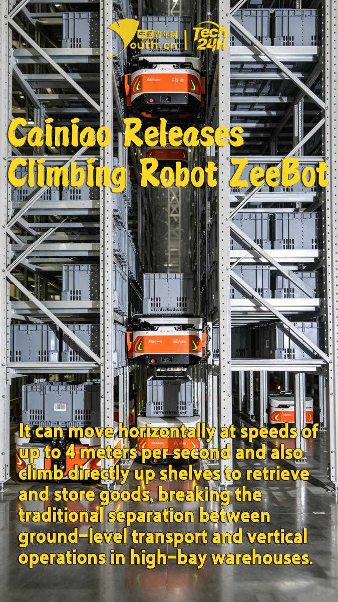 【#Tech24H】At MODEX 2026, the international logistics exhibition held in Atlanta, USA, Cainiao Group unveiled its first self-developed “climbing robot”, ZeeBot. Designed specifically for warehouse environments, the robot has a flexible structure. It can move horizontally at speeds of up to 4 meters per second and also climb directly up shelves to retrieve and store goods, breaking the traditional separation between ground-level transport and vertical operations in high-bay warehouses. According to Cainiao, compared to other automated warehouses, those using climbing robots see a 40% improvement in storage space utilization. With modular design and improved deployment efficiency, warehouses gain greater scalability and flexibility.