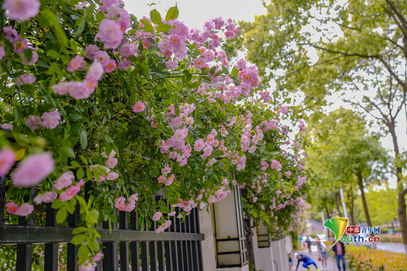 Beijing, April 22 (Youth.cn) - On April 20, 2026, along Qingchuan Avenue in Hanyang District, Wuhan City, Hubei Province, roses bloomed brilliantly in the sunlight. At the intersection with Jinxiu Second Road, dense rose vines cascade down like a waterfall, forming a 100-meter-long rose wall. This “spring-limited” beauty has become a popular spot for both locals and tourists to take photos. Photo/CFP
